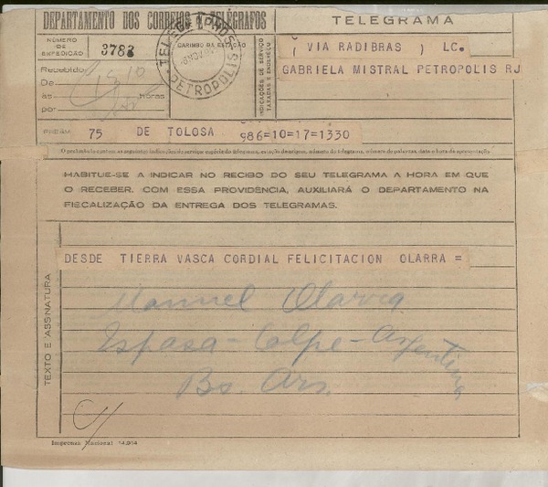 [Telegrama] 1945 nov. 8, Tolosa, [España] [a] Gabriela Mistral, Petrópolis, [Brasil] [manuscrito] [Manuel Olarra Garmendia].