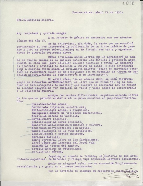 [Carta] 1951 abr. 24, Buenos Aires, [Argentina] [a] Gabriela Mistral [manuscrito] [Manuel Olarra Garmendia].