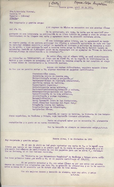 [Carta] 1951 dic. 3, Buenos Aires, [Argentina] [a] Gabriela Mistral, Rapallo, Génova, Italia [manuscrito] [Manuel Olarra Garmendia].
