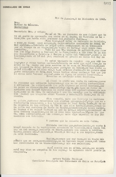 [Carta] 1945 dic. 5, Río de Janeiro [a] Esther de Cáceres, Montevideo [manuscrito] Arturo Valdés Phillips.