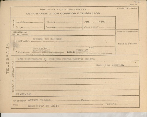 [Telegrama] 1945 nov. 21, [Brasil] [a] Esther de Cáceres, Montevideo, Uruguay [manuscrito] Gabriela Mistral.