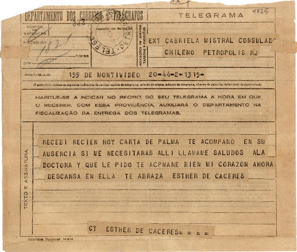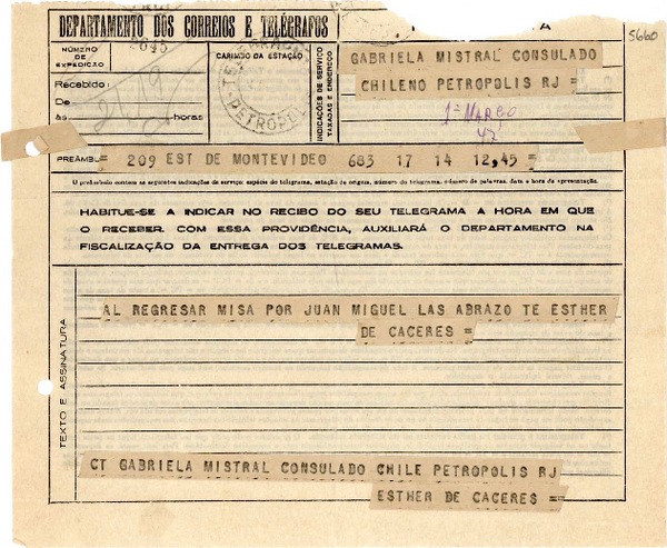 [Telegrama] [1943?], Montevideo, [Uruguay] [a] Gabriela Mistral, Consulado Chileno, Petrópolis, RJ, [Brasil] [manuscrito] Esther de Cáceres.