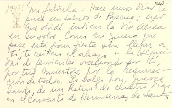 [Tarjeta] [1947?], [Uruguay] [a] Gabriela [Mistral] [manuscrito] Esther de Cáceres.