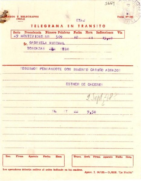 [Telegrama] [1948?] sept. 2, Montevideo, [Uruguay] [a] Gabriela Mistral, Santiago, [Chile] [manuscrito] Esther de Cáceres.