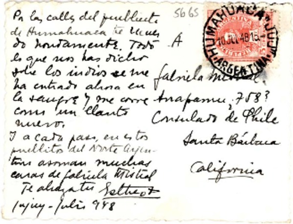[Tarjeta postal] 1948 jul., Jujuy, [Argentina] [a] Gabriela Mistral, Santa Bárbara, California [manuscrito] Esther de Cáceres.