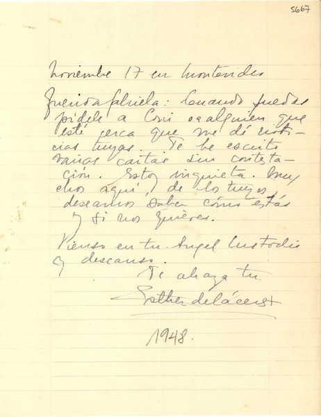 [Carta] [1948?] nov. 17, Montevideo, [Uruguay] [a] Gabriela [Mistral] [manuscrito] Esther [de Cáceres].