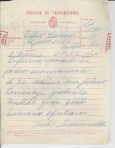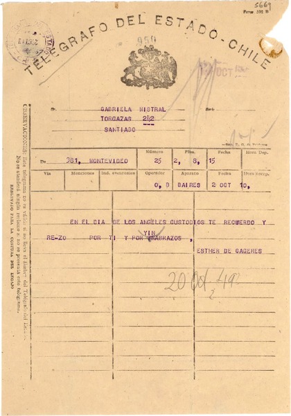 [Telegrama] [1949?] oct. 2, Montevideo, [Uruguay] [a] Gabriela Mistral, Santiago, [Chile] [manuscrito] Esther de Cáceres.