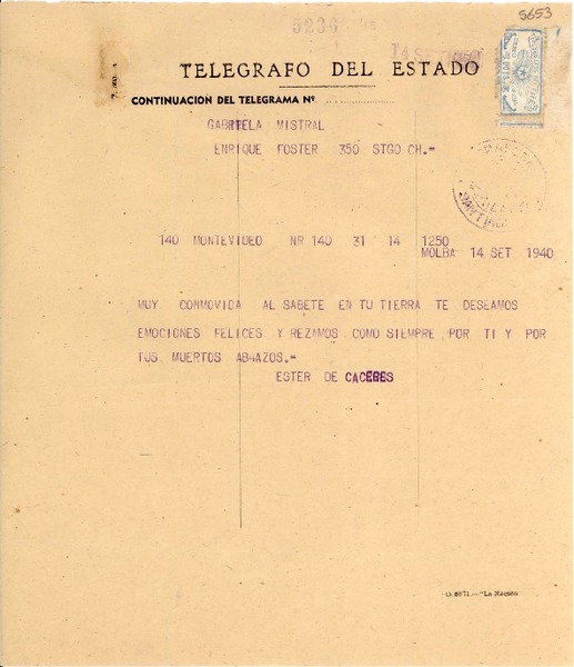 [Telegrama] 1954 sept. 14, Montevideo [a] Gabriela Mistral, Santiago de Chile [manuscrito] Esther de Cáceres.