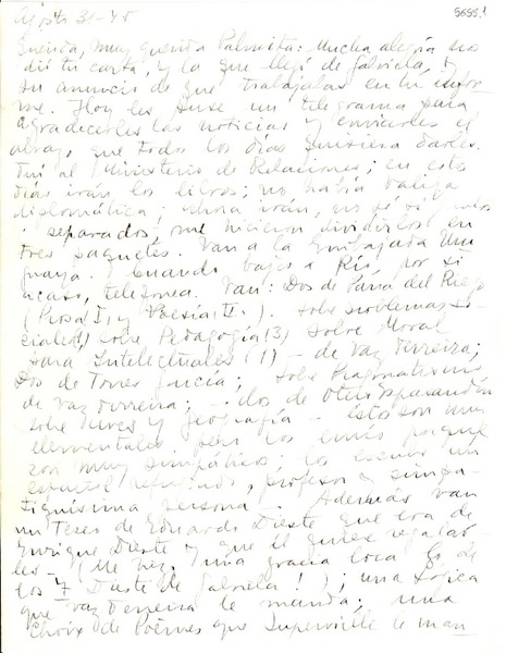 [Carta] 1945 ago. 31, [Uruguay] [a] Palma Guillén [manuscrito] Esther de Cáceres.