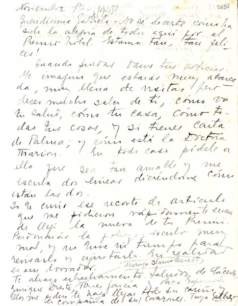 [Carta] 1956 nov. 2, [Uruguay] [a] Gabriela Mistral, Roslyn Harbor, New York [manuscrito] Esther de Cáceres.