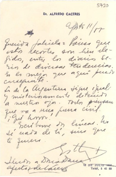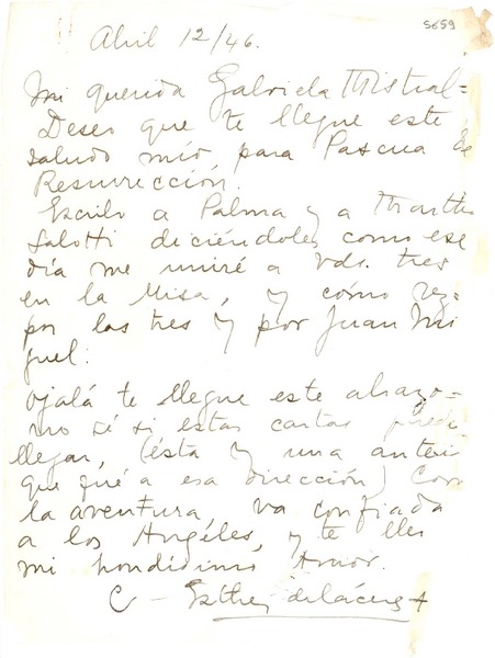 [Carta] 1946 abr. 12, [Uruguay] [a] Gabriela Mistral [manuscrito] Esther de Cáceres.