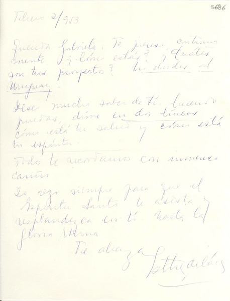 [Carta] 1953 feb. 2, [Uruguay] [a] Gabriela Mistral [manuscrito] Esther de Cáceres.