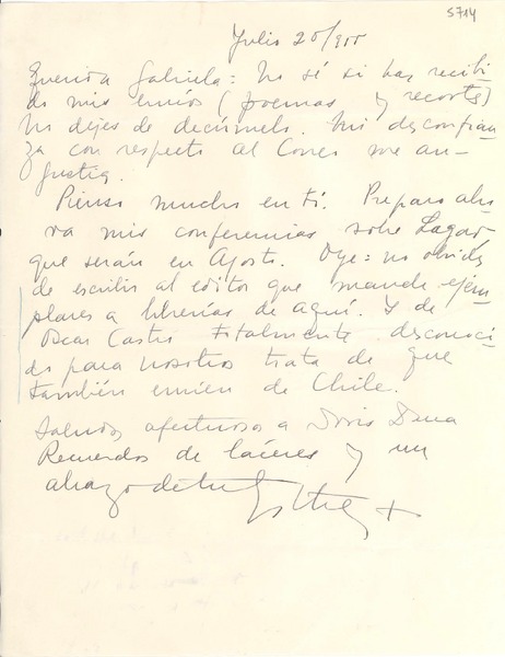 [Carta] 1955 jul. 20, [Uruguay] [a] Gabriela [Mistral] [manuscrito] Esther [de Cáceres].