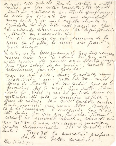 [Carta] 1944, [Uruguay] [a] Gabriela Mistral [manuscrito] Esther de Cáceres.