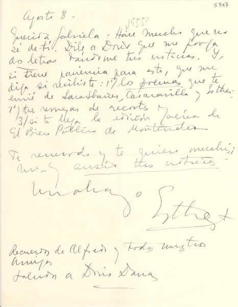 [Carta] [1955?] ago. 8, [Uruguay] [a] Gabriela [Mistral] [manuscrito] Esther [de Cáceres].