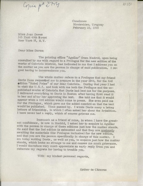 [Carta] 1965 mar. 5, [New York] [a] Esther de Cáceres, Montevideo, Uruguay [manuscrito] Joan Daves.