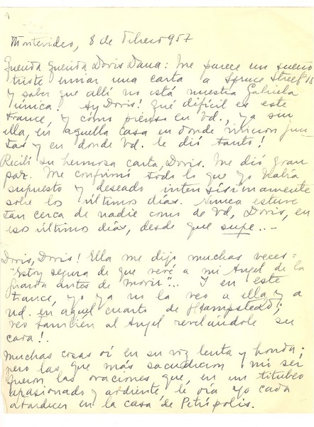 [Carta] 1957 feb. 8, Montevideo, Uruguay [a] Doris Dana, [New York] [manuscrito] Esther de Cáceres.