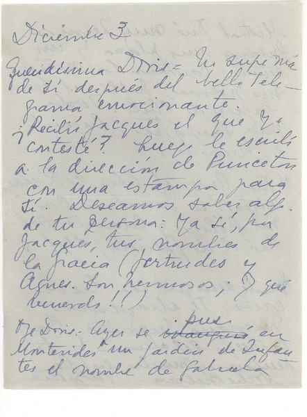 [Carta] [1957?] dic. 3, Montevideo, Uruguay [a] Doris Dana, [New York] [manuscrito] Esther de Cáceres.