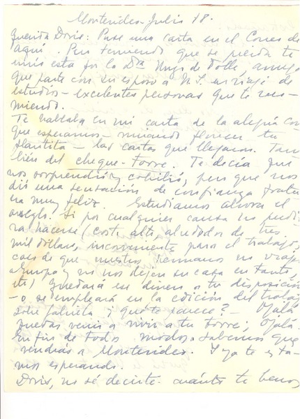[Carta] [1960?] jul. 18, Montevideo, Uruguay [a] Doris Dana, [New York] [manuscrito] Esther de Cáceres.