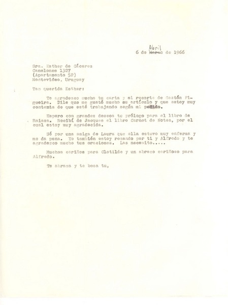 [Carta] 1966 abr. 6, [New York] [a] Esther de Cáceres, Montevideo, Uruguay [manuscrito] Doris Dana.