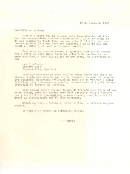 [Carta] 1966 jun. 12, [New York] [a] Esther de Cáceres, Montevideo, Uruguay [manuscrito] Doris Dana.