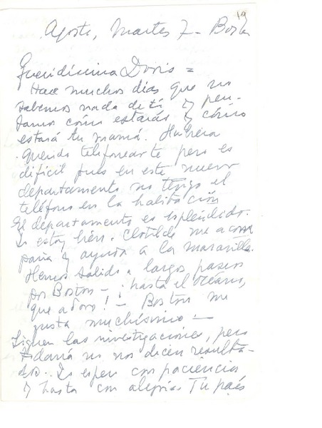 [Carta] 1962, ago. 7, Boston, Massachusetts [al] Doris Dana, [New YorK] [manuscrito] Esther de Cáceres.