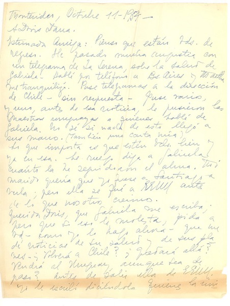 [Carta] 1946 oct. 27, Montevideo [a] Gabriela Mistral [manuscrito] Esther de Cáceres.