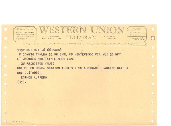 [Telegrama] 1945 nov. 24, [Uruguay] [a] Esther de Cáceres, Montevideo [manuscrito] Jules Supervielle.