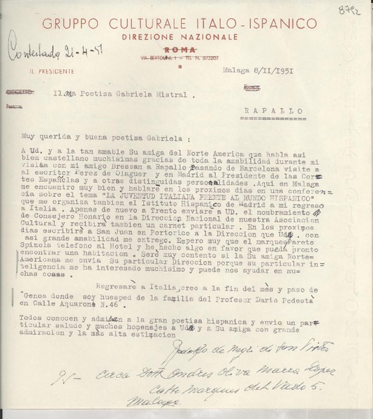 [Carta] 1951 feb. 8, Málaga, [España] [a] Gabriela Mistral, Rapallo, [Italia] [manuscrito] Rodolfo De Negri.
