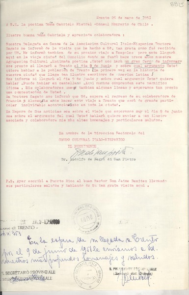 [Carta] 1951 mayo 26, Trento, [Italia] [a] Gabriela Mistral [manuscrito] Rodolfo de Negri di San Pietro.