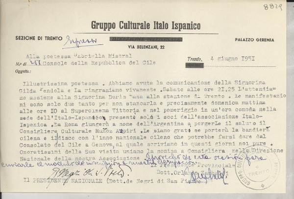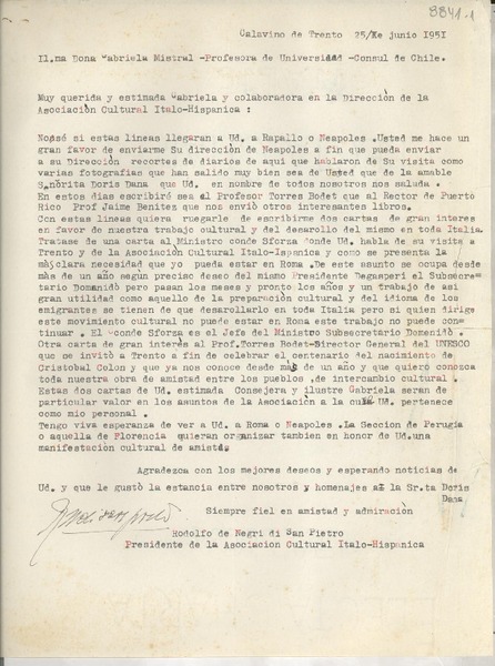[Carta] 1951 giugno 4, Trento, [Italia] [a] Gabriella [i.e. Gabriela] Mistral [manuscrito] Rodolfo de Negri di San Pietro.