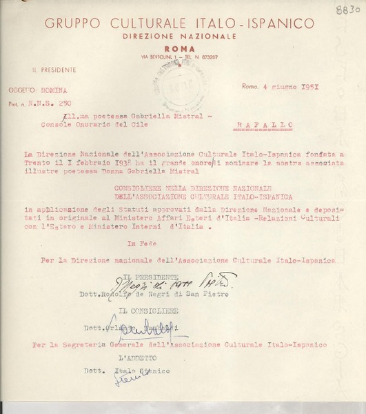 [Carta] 1951 giugno 4, Roma, [Italia] [a] Gabriella [i.e. Gabriela] Mistral [manuscrito] Rodolfo de Negri di San Pietro, Orlando Zambaldi, Italo Stenico.
