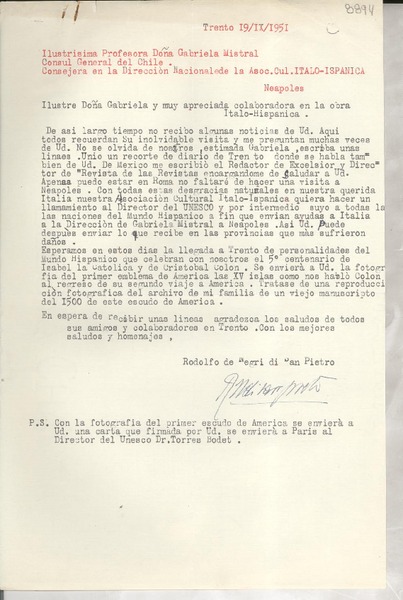 [Carta] 1951 sept. 19, Trento, [Italia] [a] Gabriela Mistral, Neapoles, [Italia] [manuscrito] Rodolfo De Negri di San Pietro.