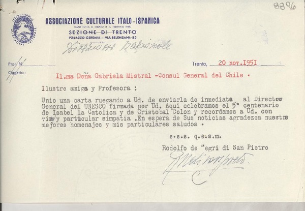 [Carta] 1951 nov. 20, Trento, [Italia] [a] Gabriela Mistral [manuscrito] Rodolfo De Negri di San Pietro.