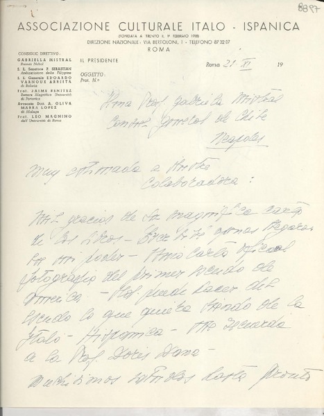 Correspondencia - Mistral, Gabriela - Manuscritos italianos - De Negri di San Pietro, Rodolfo