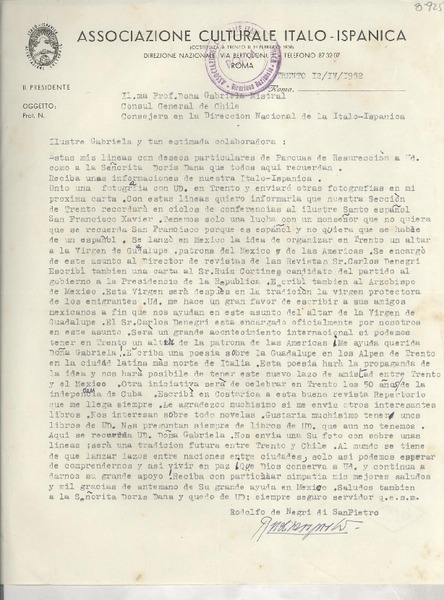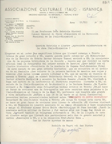 [Carta] 1951 dic. 12, Roma, [Italia] [a] Gabriela Mistral [manuscrito] Rodolfo De Negri di San Pietro.