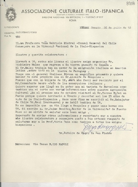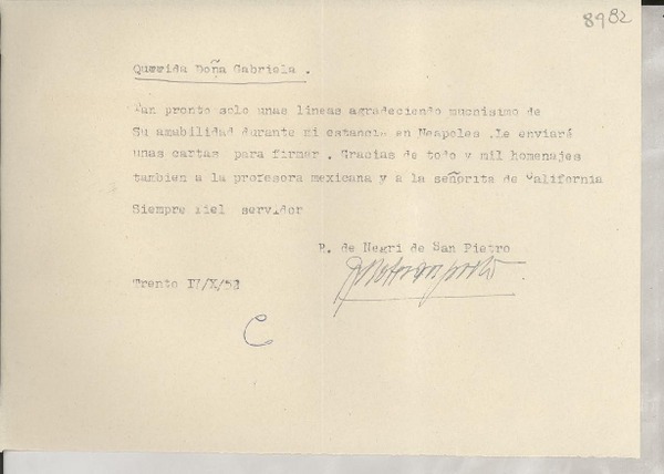 [Carta] 1952 sett. 30, Roma, [Italia] [a] Gabriela Mistral [manuscrito] Rodolfo De Negri di San Pietro.