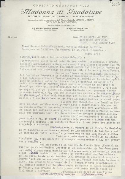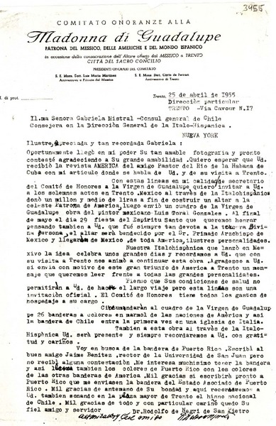 [Carta] 1955 abr. 25, Trento, [Italia] [a] Gabriela Mistral, New York [manuscrito] Rodolfo de Negri de San Pietro.