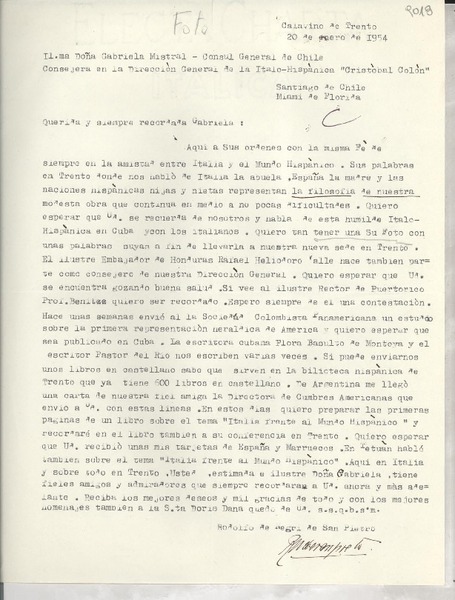 [Carta] 1954 ene. 20, Calavino de Trento, [Italia] [a] Gabriela [Mistral], Miami, [EE.UU.] [manuscrito] Rodolfo de Negri de San Pietro.