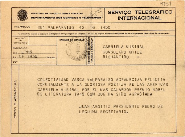 [Telegrama] 1945 nov. 16, Valparaíso [a] Gabriela Mistral, Río de Janeiro [manuscrito] Juan Abóitiz.