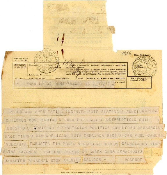 [Telegrama] 1951 ene. 22, Roma [a] Gabriela Mistral, Rapallo [manuscrito] El embajador.