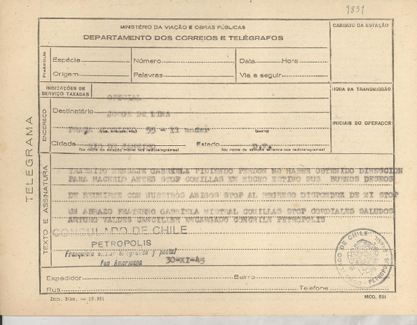 [Telegrama] 1945 nov. 16, Río de Janeiro [a] Gabriela Mistral, Petrópolis [manuscrito] Jorge de Lima.