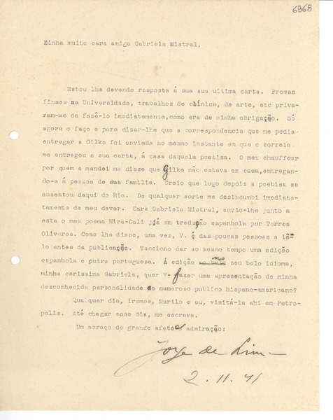 [Carta] 1941 nov. 2, [Brasil] [a] Gabriela Mistral [manuscrito] Jorge de Lima.
