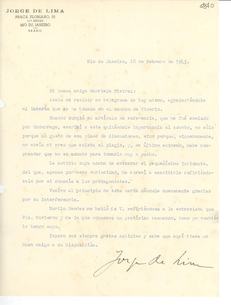 [Carta] 1943 feb. 18, Río de Janeiro [a] Gabriela Mistral [manuscrito] Jorge de Lima.