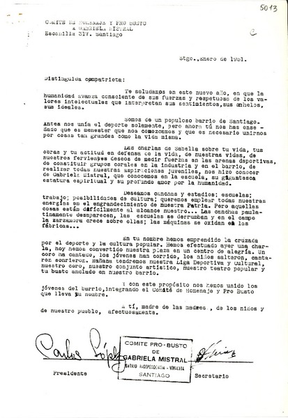 [Carta] 1951 ene., Santiago, [Chile] [a] [Gabriela Mistral] [manuscrito] Carlos López.