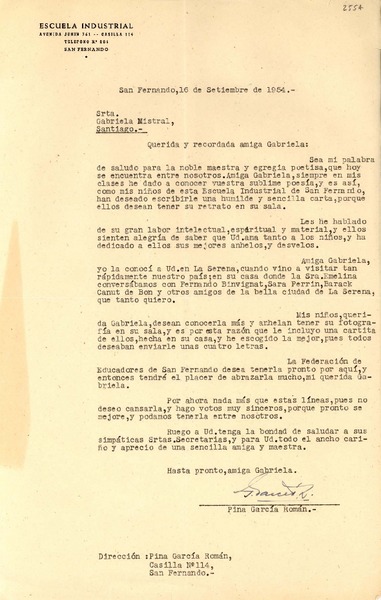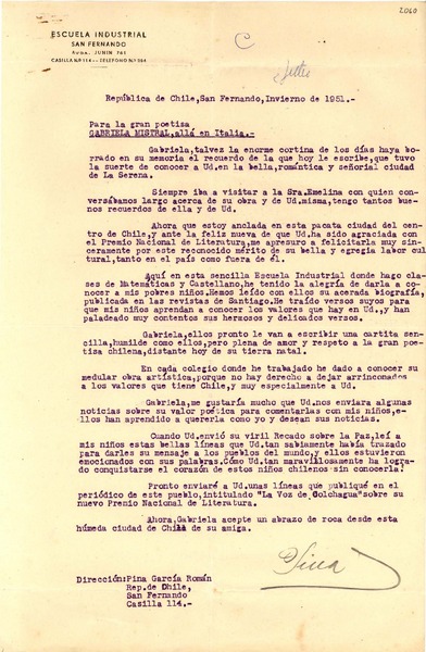 [Carta] 1951 [jul.?], San Fernando, Chile [a] Gabriela Mistral, Italia [manuscrito] Pina García Román.