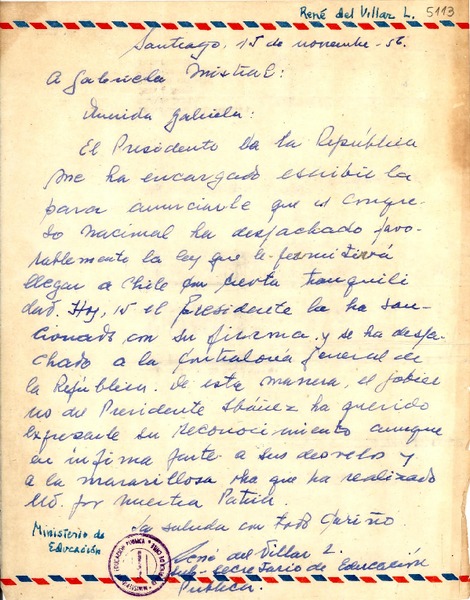 [Carta] 1956 nov. 15, Santiago [a] Gabriela Mistral [manuscrito] René del Villar L.