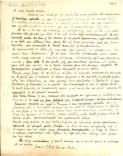 [Carta] 1942 ago. 21, Santiago [a] Gabriela Mistral [manuscrito] Juana R. A. de Aguirre.