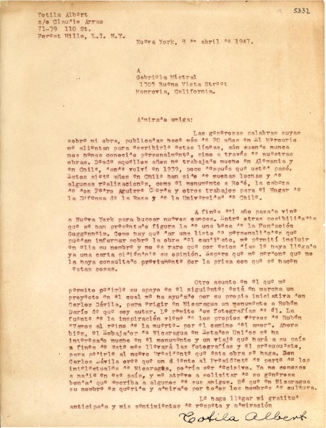 [Carta] 1947 abr. 8, Nueva York, [EE.UU.] [a] Gabriela Mistral, Monrovia, California, [EE.UU.] [manuscrito] Totila Albert.