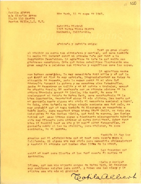 [Carta] 1947 mayo 11, New York, [EE.UU.] [a] Gabriela Mistral, Monrovia, California, [EE.UU.] [manuscrito] Totila Albert.
